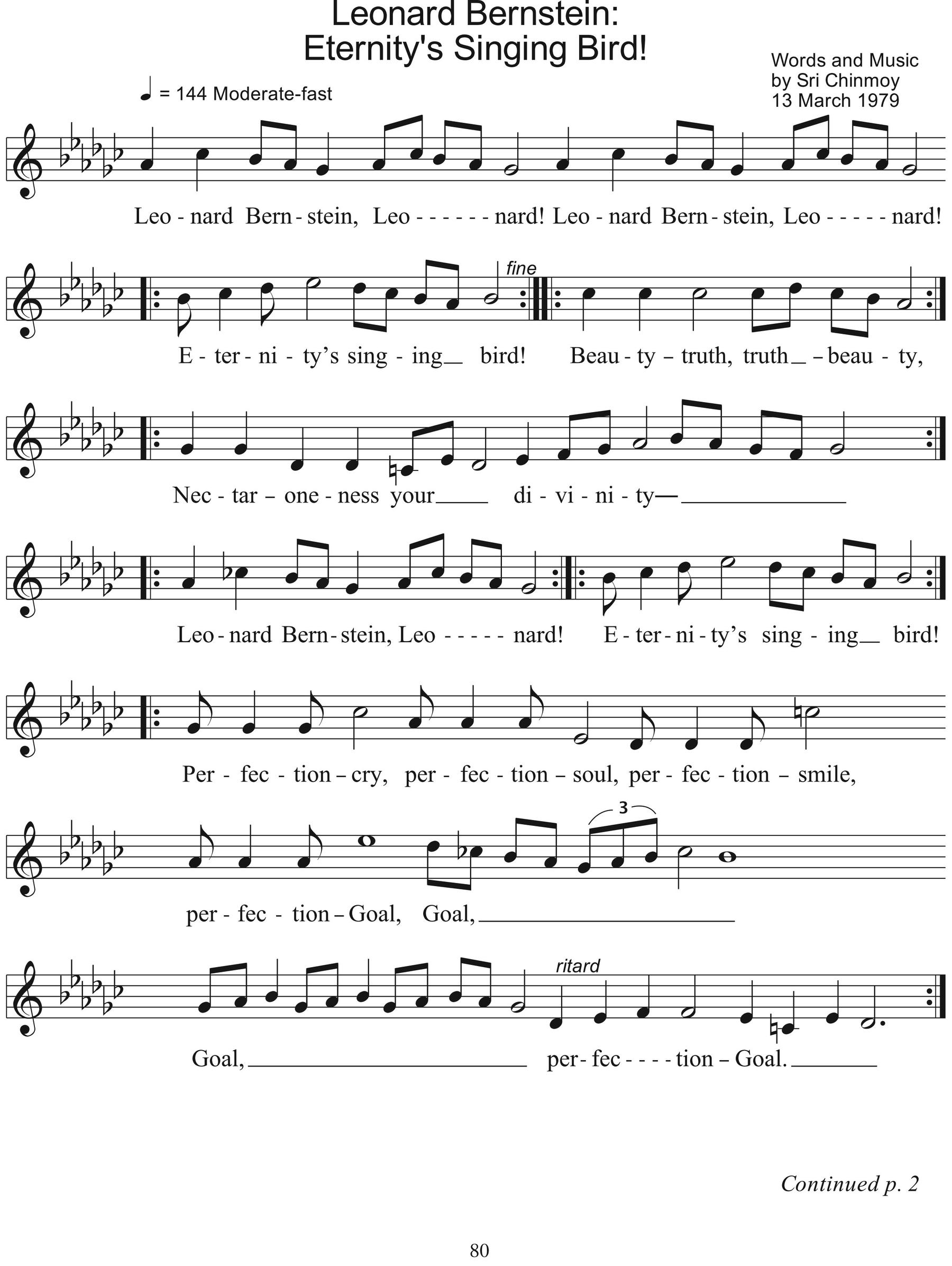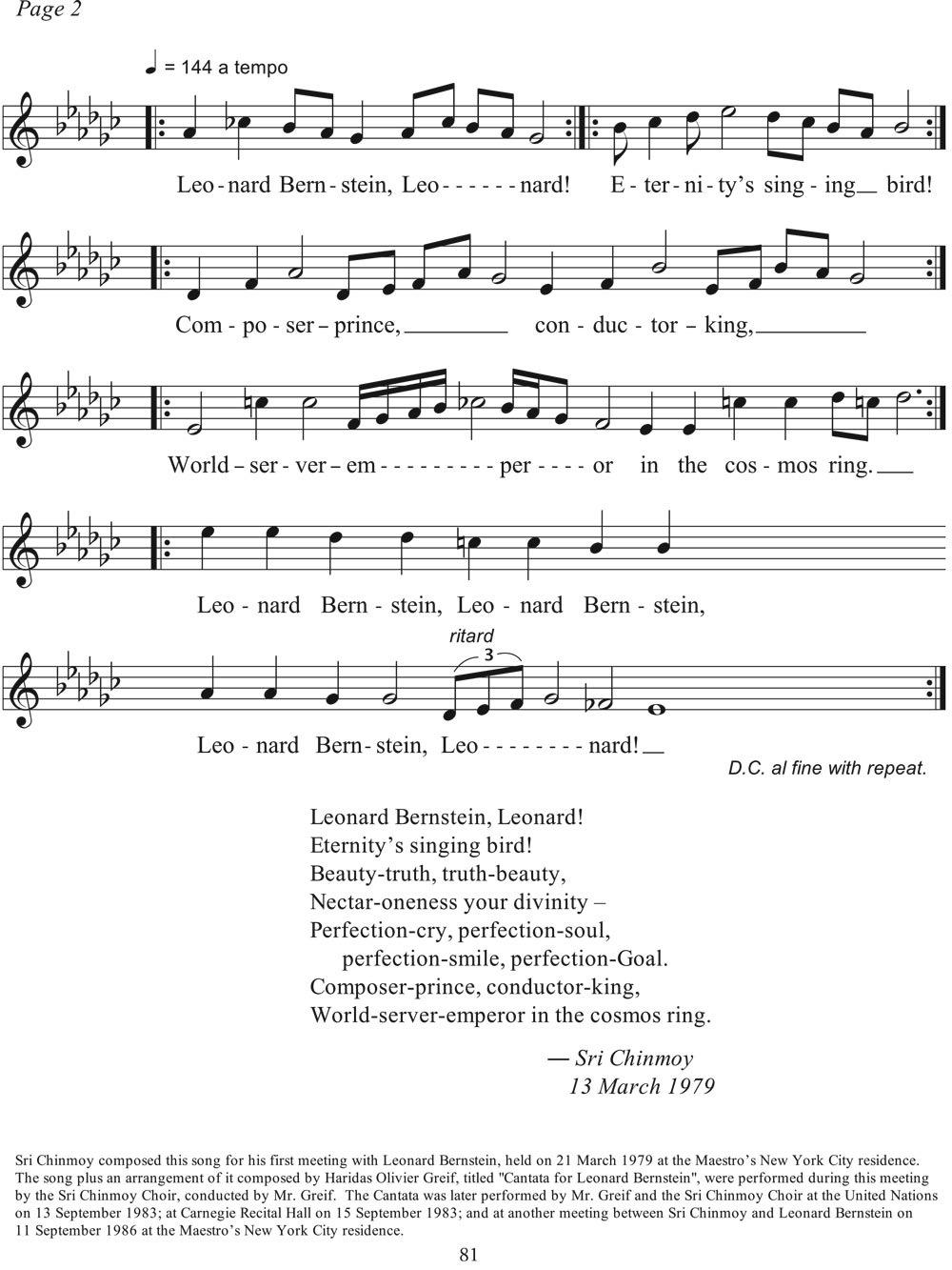 Leonard Bernstein, Leonard! Eternity’s singing bird! Beauty-truth, truth-beauty, Nectar-oneness your divinity — Perfection-cry, perfection-soul, Perfection-smile, perfection-Goal. Composer-prince, conductor-king, World-server-emperor in the cosmos ring.