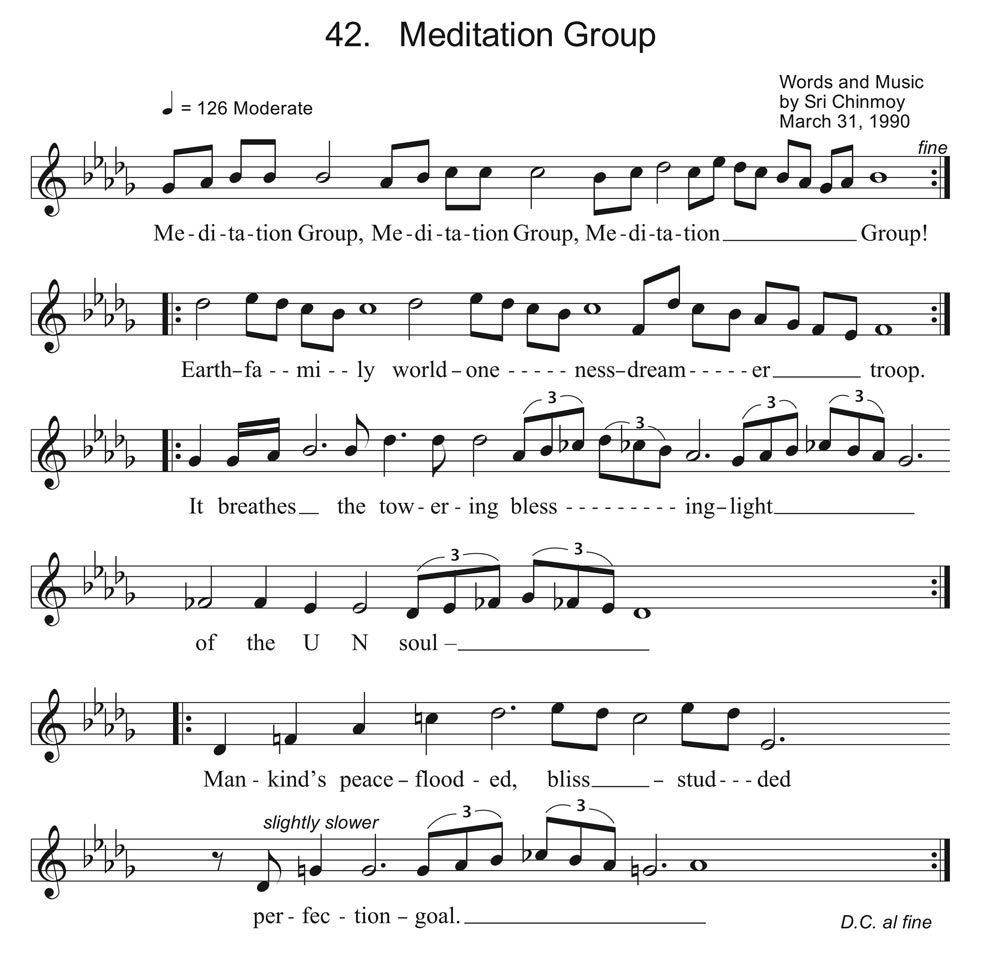Meditation Group, Meditation Group, Meditation Group, Earth-family world-oneness-dreamer-troop. It breathes the towering blessing-light of the UN soul. Mankind’s peace-flooded, bliss-studded perfection-goal.