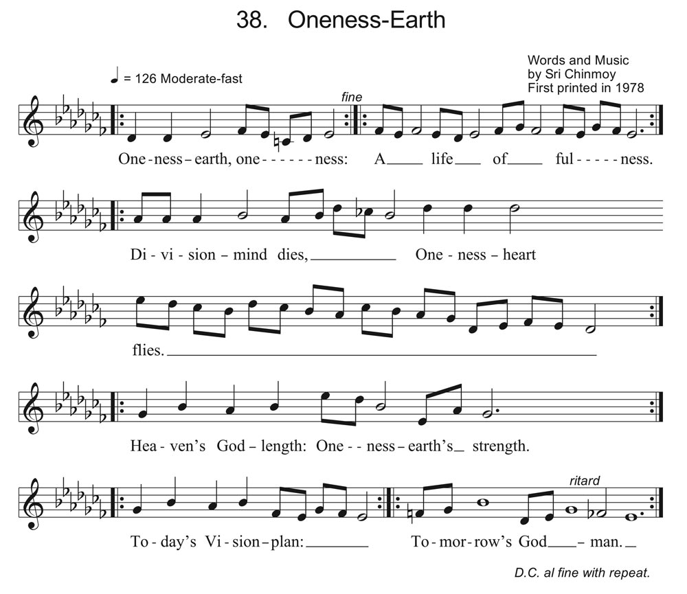 Song written for a Peace Meditation Group programme, held at the United Nations on 14 December 1977, entitled "Oneness-Earth," celebrating the universal brotherhood and unity evoked during the year-end holiday season around the world. Filmed by CBS-TV for broadcasting on Christmas Day, the event featured statements by Ambassadors and UN officials, as well as the performance of the song.