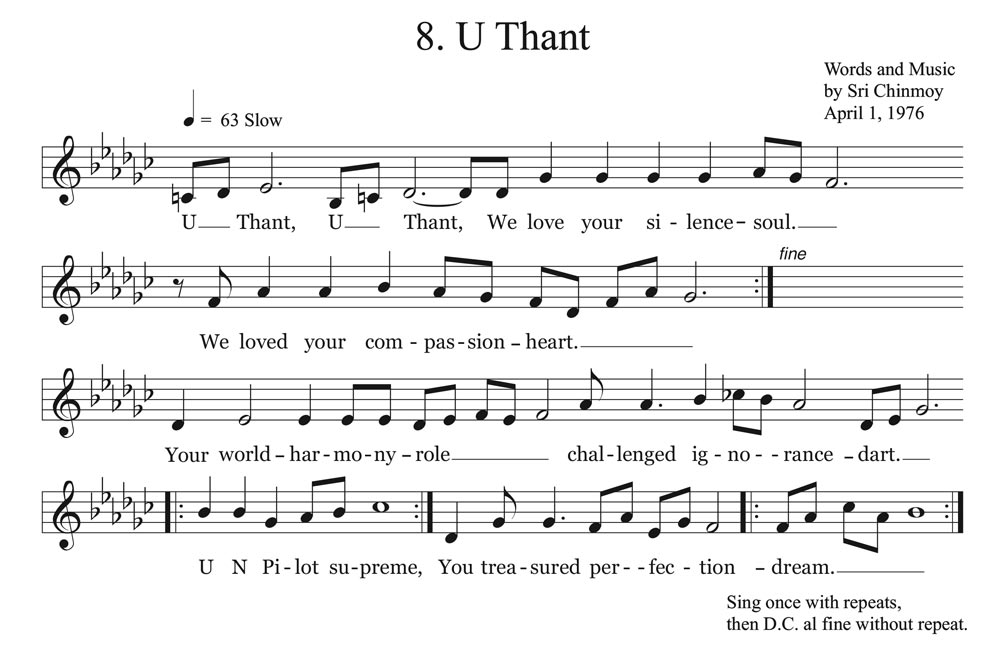 U Thant, U Thant, We love your silence-soul, We loved your compassion-heart. Your world-harmony role Challenged ignorance-dart. UN Pilot supreme, You treasured perfection-dream.