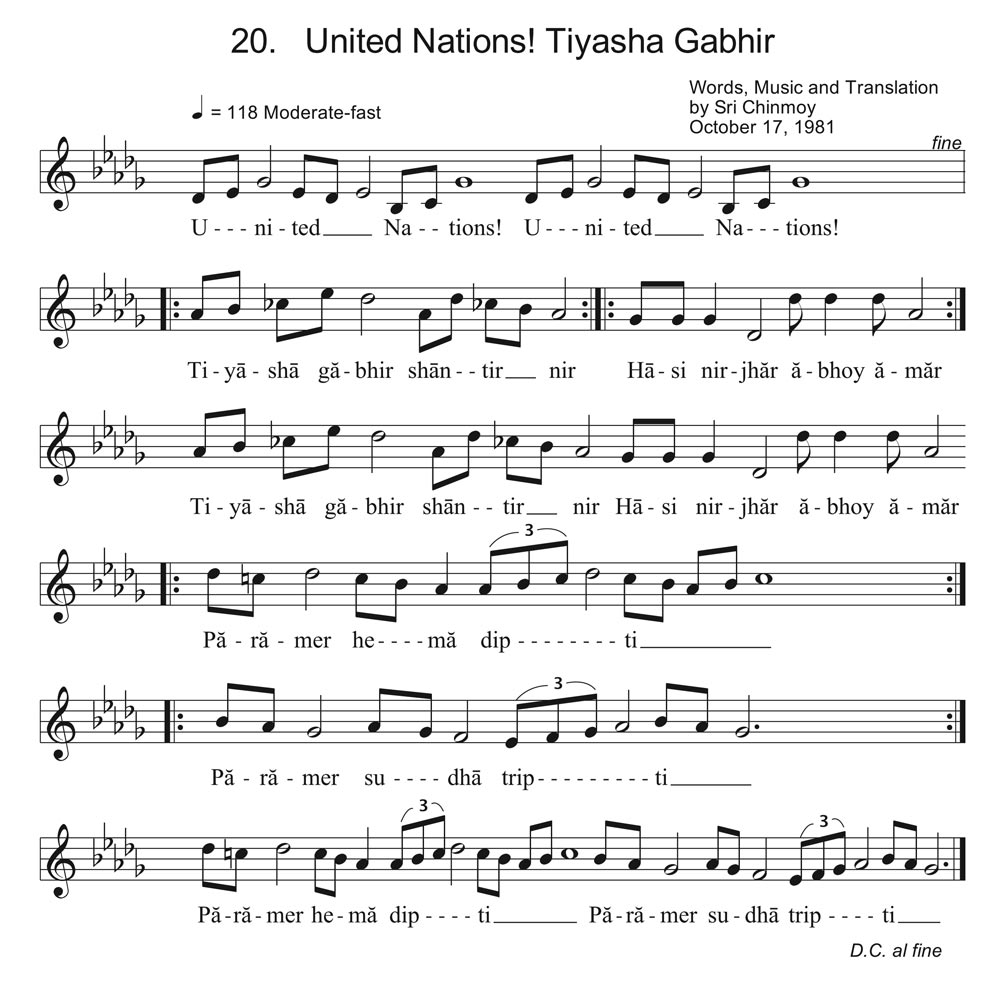 United Nations, United Nations! Tiyasha gabhir shantir nir Hasi nirjhar abhoy amar Paramer hema dipti Paramer sudha tripti