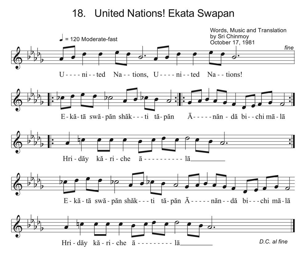 United Nations! United Nations! O unity-dream, O power-sun, O ecstasy-ocean, My heart of Light supreme!