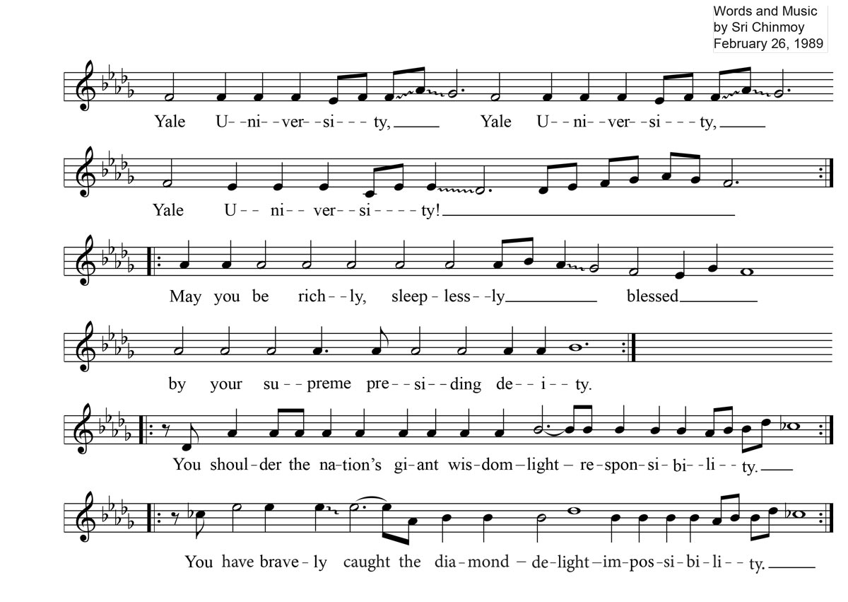 Yale University, Yale University, Yale University! May you be richly, sleeplessly blessed by your supreme presiding deity. You shoulder the nation’s giant wisdom-light-responsibility. You have bravely caught the diamond-delight-impossibility.